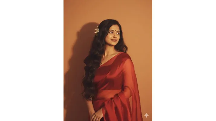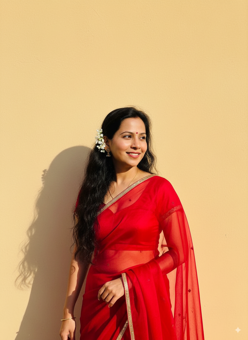 Convert the uploaded image into a stunning 4K HD portrait. The subject should have long, dark, wavy hair cascading over her shoulders. She should be wearing a translucent, elegant red saree draped over one shoulder, which reveals a fitted blouse underneath. White flowers should be tucked behind her right ear. She is looking slightly to her right, with a soft, serene expression. I want her face to remain exactly as it appears in the uploaded image without any alterations. The background should feature a plain, warm-toned wall, illuminated by a warm light source from the right, creating a distinct, soft-edged shadow of her profile and hair on the wall behind her. The overall mood should be retro and artistic.