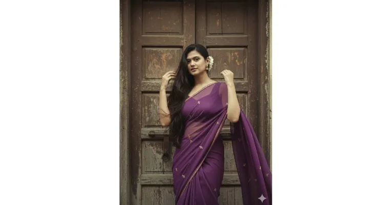 Create a retro, vintage-inspired image—grainy yet bright—based on the uploaded picture. The girl should be draped in a perfect purple chiffon, Pinterest-style aesthetic saree. The vibe must capture the essence of a ’90s movie ‘baddie,’ with dark brown, silky hair and a small flower tucked visibly into her hair, enhanced by a windy, romantic atmosphere. She is standing against an old wooden door, where deep shadows and dramatic contrasts add mystery and artistry to the scene, creating a moody yet enchanting cinematic effect. Her pose should suggest that she is adjusting her hair.